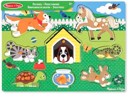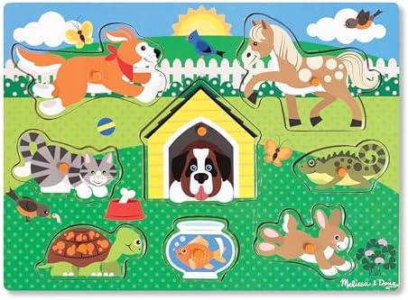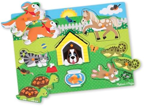 Descoperă aventurile delicioase de puzzle pentru copii de la Melissa & Doug: 8 animale de companie vesele (câini, pisici, cai, șopârle, iepuri, pești aurii și broaște țestoase) așteaptă să fie plasate la locul potrivit în acest puzzle din lemn cu fundal colorat cu animale de companie.