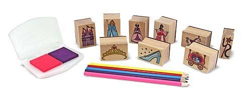 Melissa & Doug – Set de stampile Printese Un set de stampile special pentru micile printese. Setul contine: o tusiera cu 2 culori 5 creioane colorate 9 stampile diferite. Stamipele vin intr-o cutie din lemn pentru a fi pastrat si depozitat cu usurinta. Cerneala este nontoxica si lavabila. Iti dorim spor la stampilat!