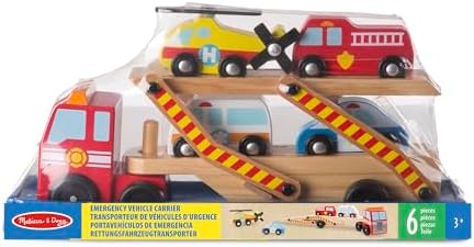 Set de joacă din lemn cu un remorcher cu două nivele care poate transporta și livra patru vehicule de salvare | Include transportor de vehicule, elicopter, autospecială de pompieri, mașină de poliție și ambulanță | Nivelul superior se extinde pentru a face camionul aproape 24 de inch lungime și permite vehiculelor să se rostogolească și să se desfășoare | Construcție solidă din lemn de înaltă calitate și culori vii, vii | Cadou perfect de Crăciun pentru copiii de toate vârstele